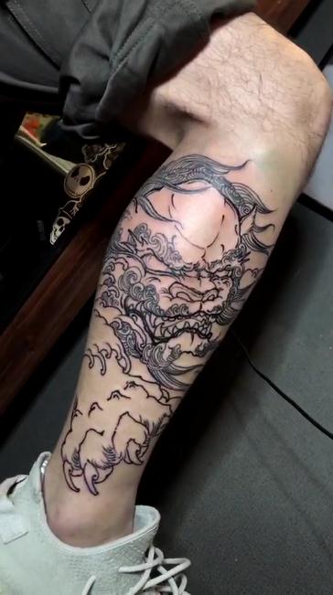 小腿唐狮纹身图案割线已完成视频